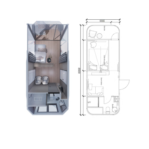 | Configuración estándar interna | Decoración de pared / techo | Pared / techo de la sala de estar / dormitorio: Tablero OSB para el panel de revestimiento; tablero de fibra de madera y bambú para la decoración del revestimiento Pared de baño: Placa de presión de fibra de cemento impermeable para panel de revestimiento; Tablero resistente a los rayos UV estilo mármol para decoración de revestimiento |