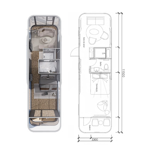 Configuración estándar interna | Decoración de pared / techo | Pared / techo de la sala de estar / dormitorio: Tablero OSB para el panel de revestimiento; tablero de fibra de madera y bambú para la decoración del revestimiento Pared de baño: Placa de presión de fibra de cemento impermeable para panel de revestimiento; Tablero resistente a los rayos UV estilo mármol para decoración del revestimiento |