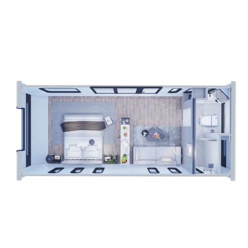Configuración estándar interna | Decoración de pared / techo | Pared / techo de la sala de estar / dormitorio: Tablero OSB para el panel de revestimiento; tablero de fibra de madera y bambú para la decoración del revestimiento Pared de baño: Placa de presión de fibra de cemento impermeable para panel de revestimiento; Tablero resistente a los rayos UV estilo mármol para decoración del revestimiento |