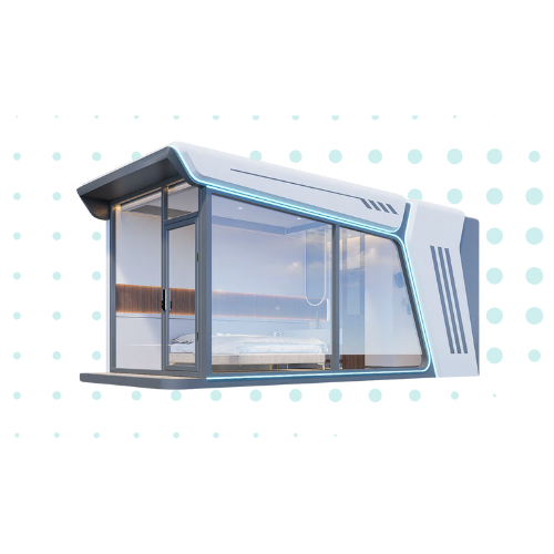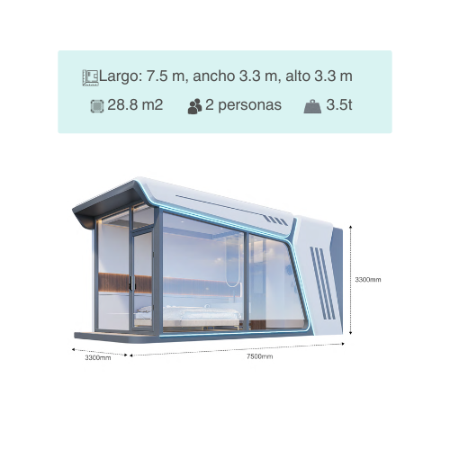 La casa cápsula espacial usa materiales ligeros y resistentes, como aleaciones de aluminio y titanio. Cuenta con vidrio doble aislante, ventanas panorámicas de 270° y tragaluces, con un diseño futurista y tecnológico que brinda una experiencia espacial única.