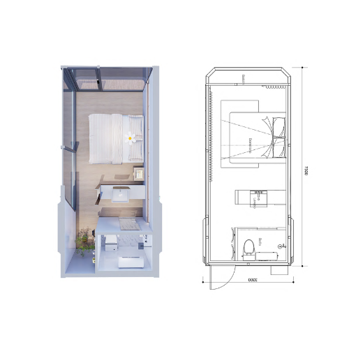 Configuración estándar interna | Decoración de pared / techo | Pared / techo de la sala de estar / dormitorio: Tablero OSB para el panel de revestimiento; tablero de fibra de madera y bambú para la decoración del revestimiento Pared de baño: Placa de presión de fibra de cemento impermeable para panel de revestimiento; Tablero resistente a los rayos UV estilo mármol para decoración del revestimiento |