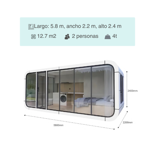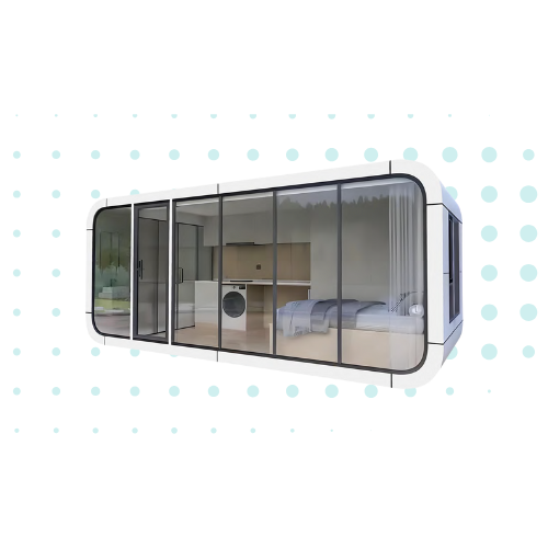 La casa cápsula espacial usa materiales ligeros y resistentes, como aleaciones de aluminio y titanio. Cuenta con vidrio doble aislante, ventanas panorámicas de 270° y tragaluces, con un diseño futurista y tecnológico que brinda una experiencia espacial única.