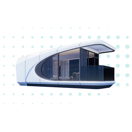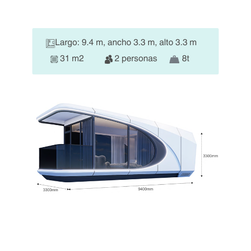 La casa cápsula espacial usa materiales ligeros y resistentes, como aleaciones de aluminio y titanio. Cuenta con vidrio doble aislante, ventanas panorámicas de 270° y tragaluces, con un diseño futurista y tecnológico que brinda una experiencia espacial única.