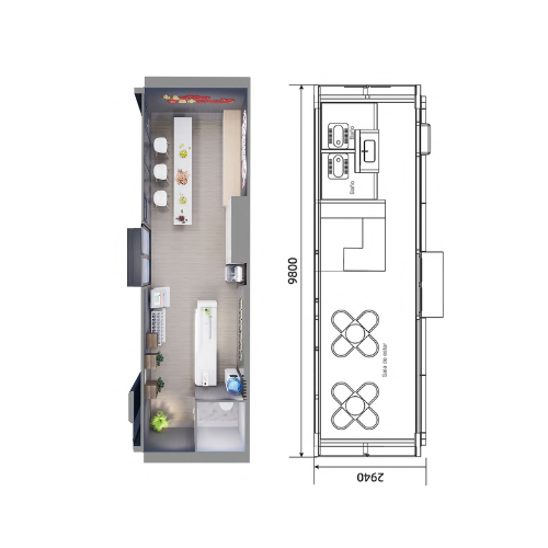 Configuración estándar interna | Decoración de pared / techo | Pared / techo de la sala de estar / dormitorio: Tablero OSB para el panel de revestimiento; tablero de fibra de madera y bambú para la decoración del revestimiento Pared de baño: Placa de presión de fibra de cemento impermeable para panel de revestimiento; Tablero resistente a los rayos UV estilo mármol para decoración del revestimiento |
